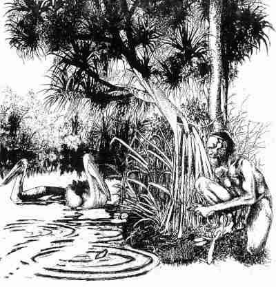 Aborigines would often traditionally hunt some quarries without any kind of aid or weapon. Pelicans, for example, could be caught by throwing mussels into the water near the birds to imitate the sound of jumping fish. The hunter remaining concealed, would gradually shorten the range of his throw bringing the bird progressively nearer, until it could be either killed with a boomerang, or even taken by hand. Sometimes the hunter would just tap the water with his hand or a stone to lure the bird towards the place where he was hidden. |