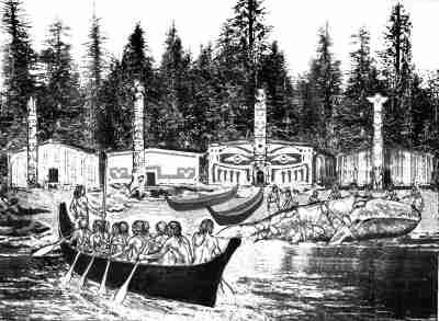 For the people of the Northwest Coast the abundance of marine resources must have been one of the most important factors determining the availability of food. To exploit these resources effectively the people needed either canoes, or boats, which they made by hollowing out the trunks of cedar trees or of the giant redwood. Some boats were as much as sixty foot long, with a seven foot beam and could hold up to sixty people. To hunt larger marine mammals such as sea lion and whales, harpoons were used with floats attached to prevent them escaping. When whales were caught their mouths were sown up and additional floats were fastened to the animal to keep it afloat until it could be beached. |