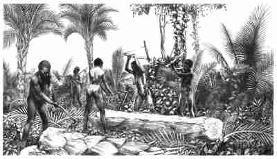 There is evidence that people who lived in the rainforests of New Guinea had already begun by 30,000 years ago to exert some control over their environment. Although still hunter-gatherers, it is thought that they were deliberately encouraging the growth of some wild food plants such as yams and sago, by draining glades and cutting back jungle in those places where they grew naturally. Sago is prepared by stripping the outer layers from the trunk of a felled sago palm and beating the fibrous contents to a pulp before removing it and rinsing it through with water to release a starch rich paste that is then dried to make flour. Large axe heads have been found from this period which it is thought were used to ring bark trees, clear roots and undergrowth and to thin out stands of food plants. |